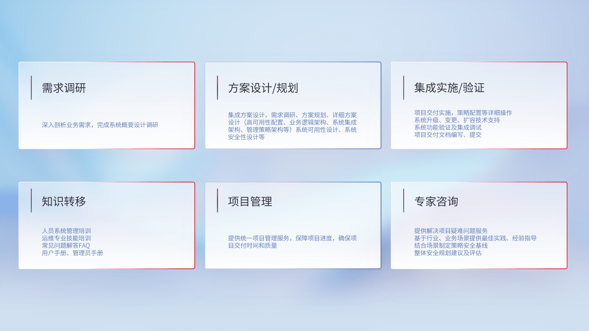 针对客户行业特性,,,将宏观的安全战略和需求,,,通过专业的交付服务,,实现项目落地,,,,为客户提供标准规范的集成交付服务。。。